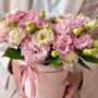 На фото композиция 11 розовых эустом в коробке. В составе: эустома (лизиантус) 11 шт, рускус 5 шт, оазис флористический 1 шт, шляпная коробка (m) 1 шт, атласная лента 1 шт, . Все цветы свежие и ароматные, букет красиво оформлен и отлично подходит для подарка. Доступна доставка цветов или самовывоз.